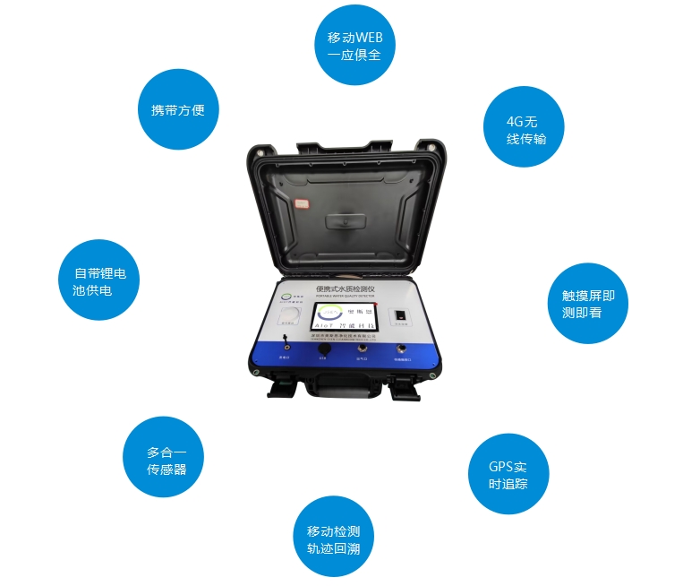 自带锂电池 ,开机就可以使用,方便使用者户外水样测定操作,测定过程简捷 、测定结果准确 、节约测定成本。设备搭载触摸屏显示实时数值,主控机通过RS485(Modbus/ R-TU协议) 总线采集和处理各数字传感器测量得到的数据 ,并将数据无线传送到平台、云端 ,同时根据用户需求可以在手机APP等多平台上获取传感器测量值。